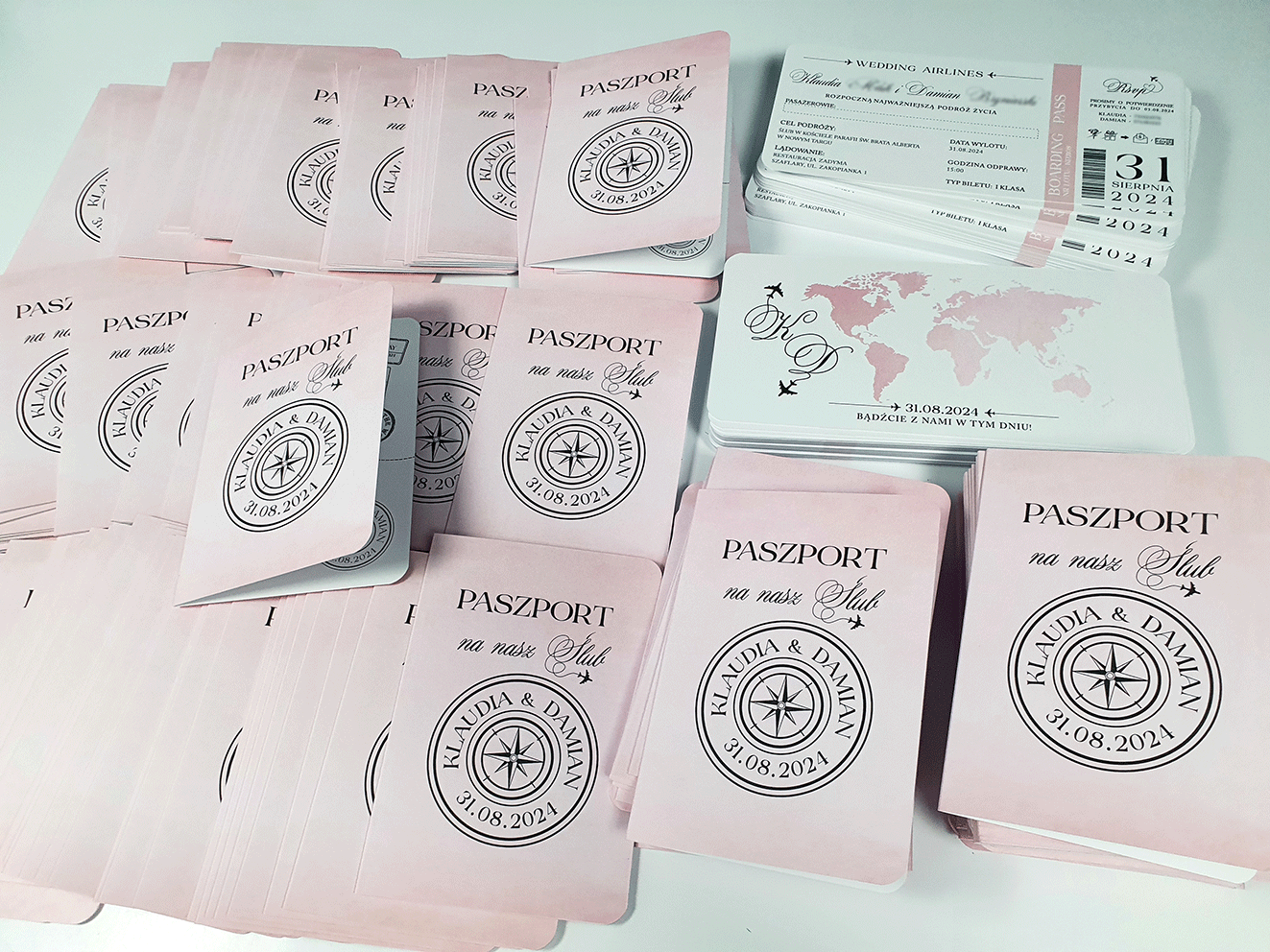 składane zaproszenie w formie paszportu 10 x15 cm + dwustronna karta Boarding Pass w formacie DL. Zaproszenie w całości drukowane na wysokiej jakości papierze 340gram